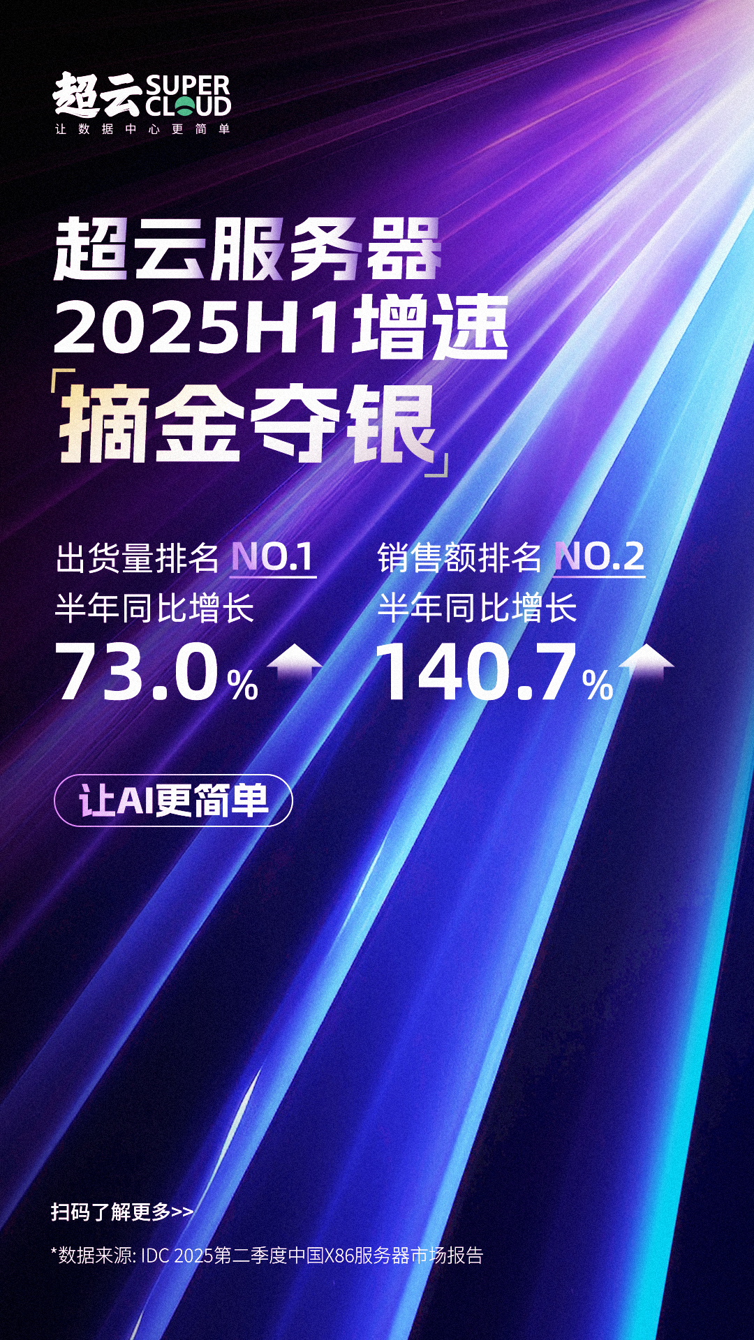 在这一轮AI算力浪潮中,超云表现尤为亮眼,交出“摘金夺银”的亮眼成绩单:出货量上半年同比增长73%,增速位居行业第一;销售收入上半年同比增长140.7%,增速位列行业第二;仅第二季度单季销售额同比增长达147.4%,远超市场平均增速。从出货到营收,超云以远高于行业的增长曲线,彰显出在AI时代的强劲竞争力与市场领先地位。